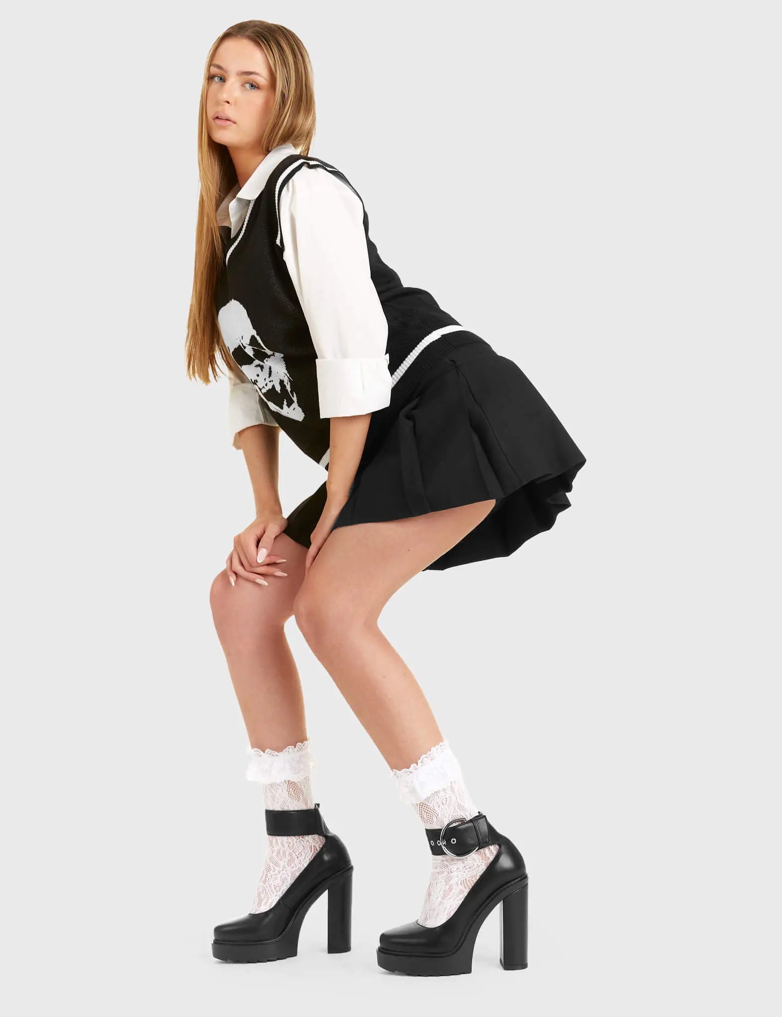 Midnight Glow Platform Heels in Black faux leather. These platform heels feature a large strap around the ankle with silver eyelets and a large silver 'O' ring buckle. They are the perfect way to elevate any look. Made with eco-friendly materials and 100% cruelty-free, these platform boots are as ethical as they are Trendy.