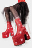 Keeper Chunky Platform Ankle Creeper Boot in Red Glitter. These red vegan Platform Boots feature our iconic glitter detail throughout with pink suede hearts, leave a trail of sparkle and make every step a dazzling statment Made with eco-friendly materials and 100% cruelty-free, these platform boots are as ethical as they are Dazzling!